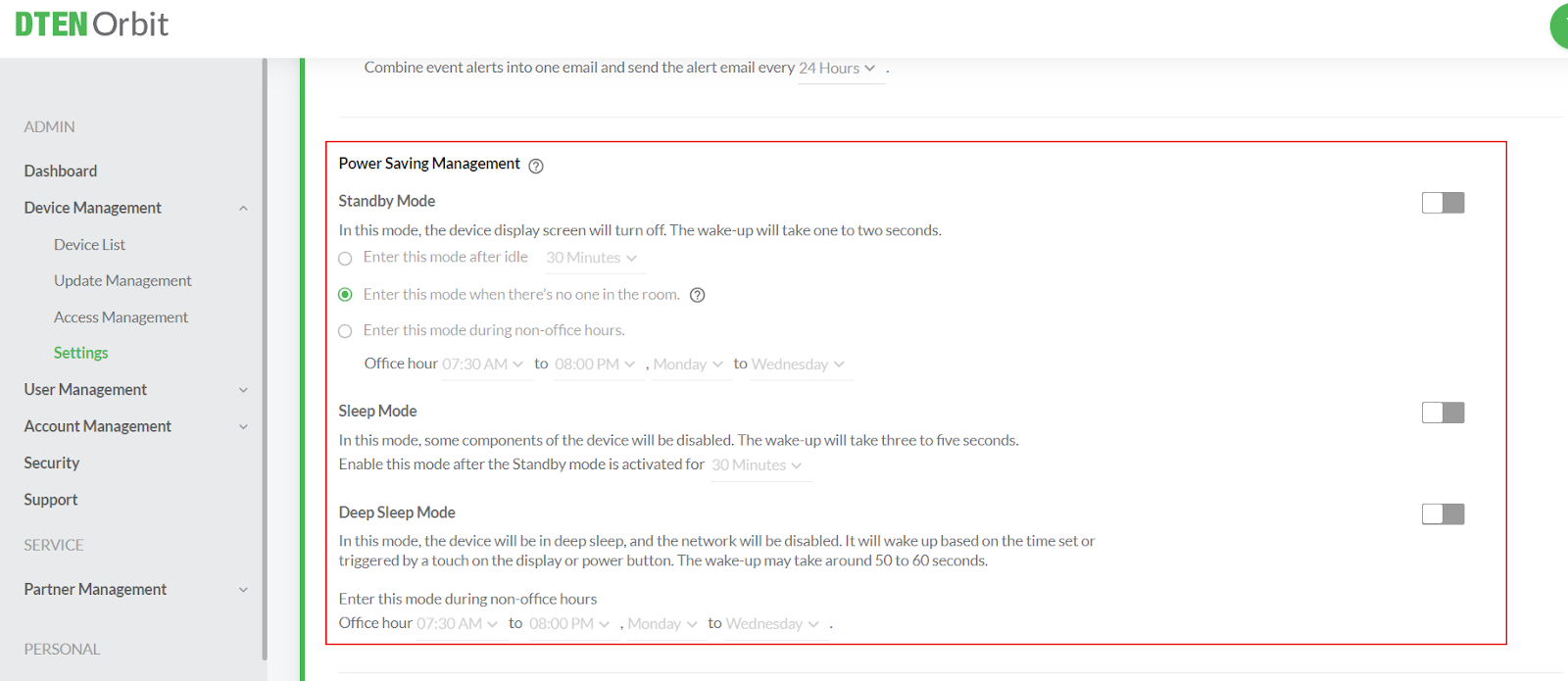 - If you enable DTEN Power Saving Management, it is recommended to disable the Zoom Device Operation Time or Microsoft Teams Rooms Office Time settings.