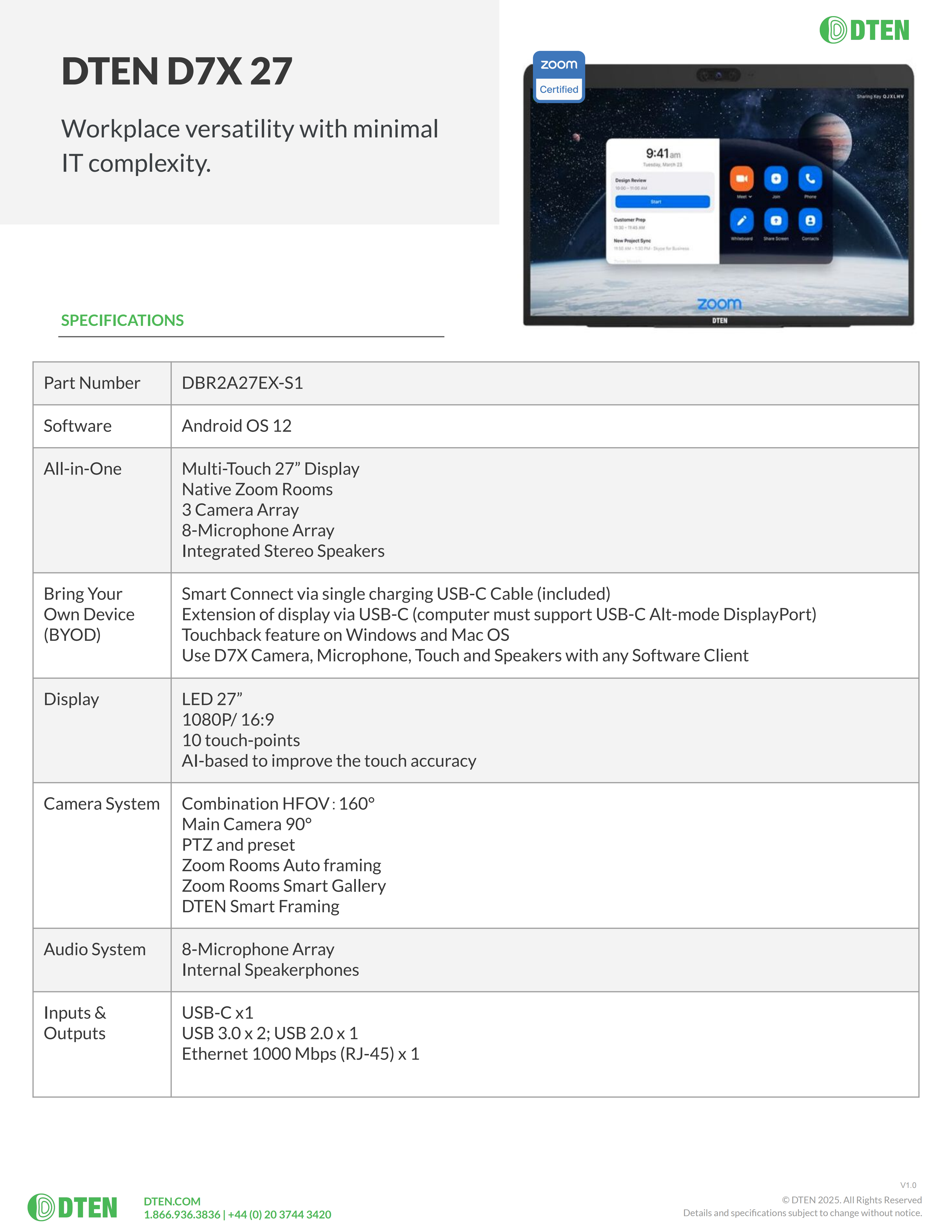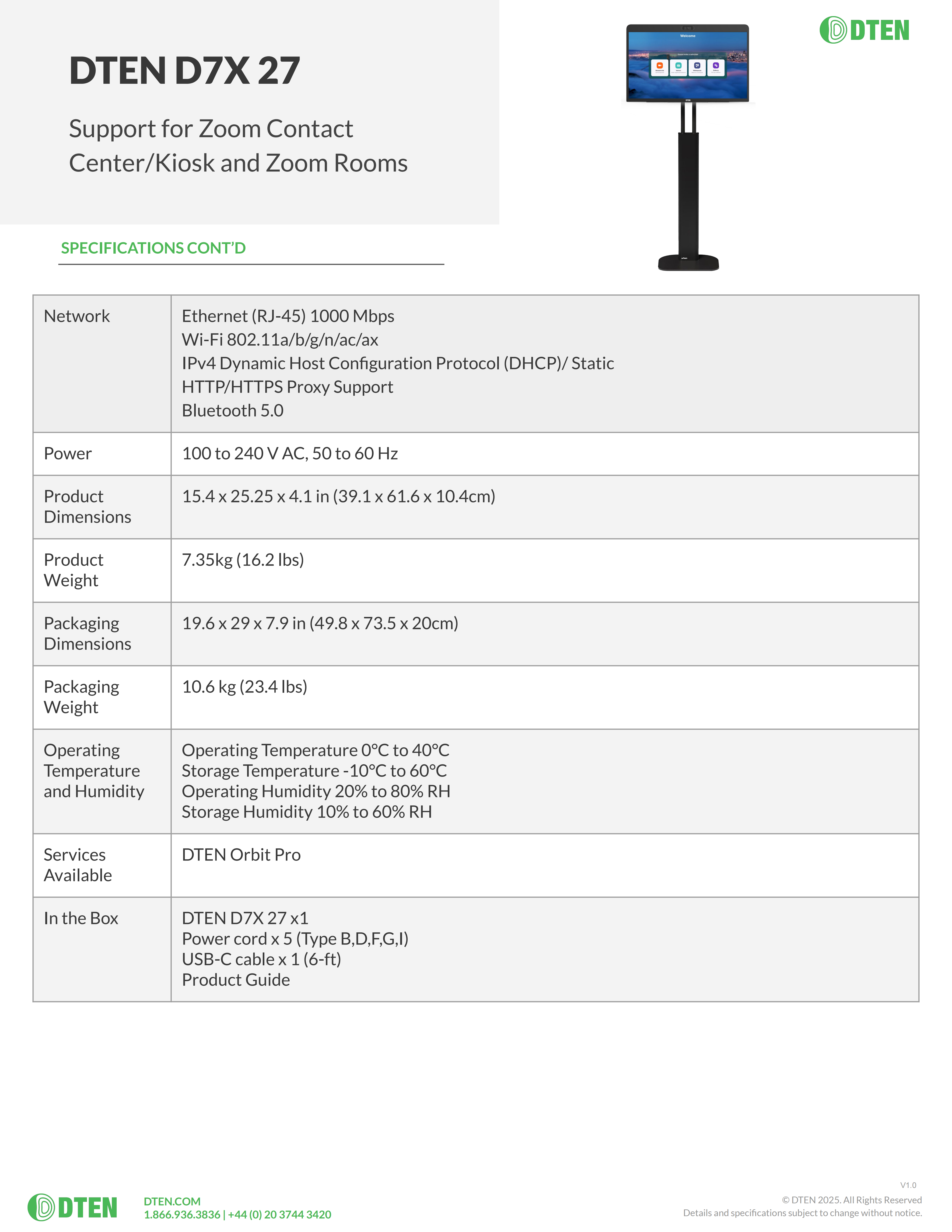 D7X 27 Specifications DTEN-D7X-27-Spec-Sheet-v1.0.pdf 500 KB Download Related articles D7X 27 Product Guide D7X 55 & 75 Specifications ON 55" Product Guide DTEN MATE Dock Specifications DTEN Lock dashboard for D7X 55 & 75 Windows Comments 0 comments Article is closed for comments.