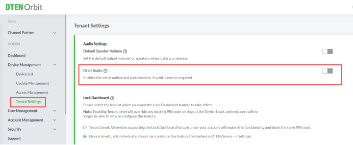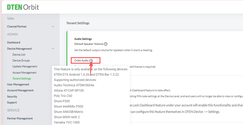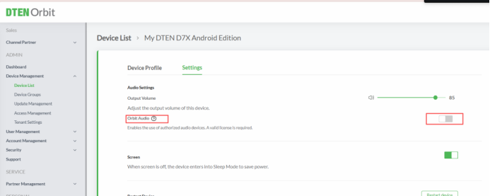 Check and choose to enable Orbit Audio on Device> Settings level for a specific DTEN unit in the device's Settings page.